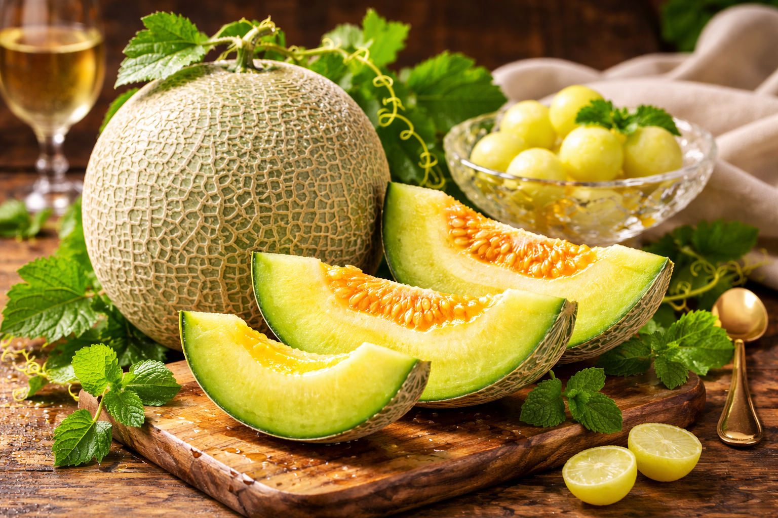 光沢のある網目模様と芳醇な香りが特徴の高級メロン。とろけるような食感が魅力です。